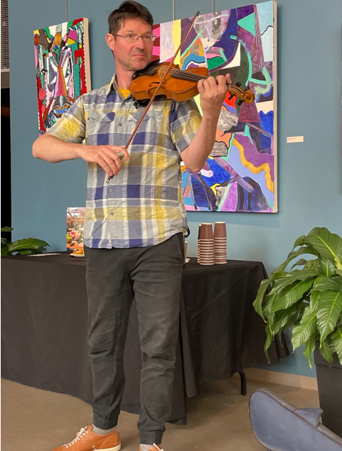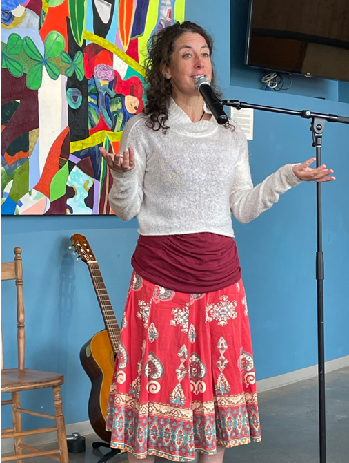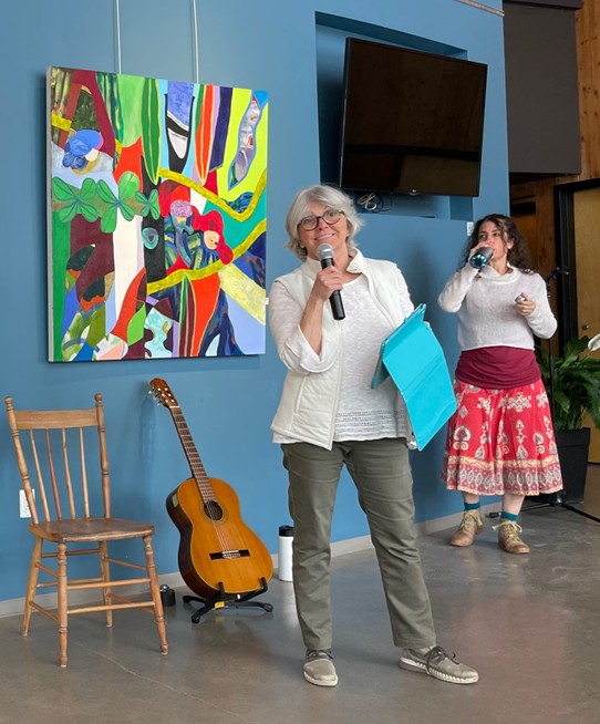 Après le repas rempli d’échanges et de rires nous avons accueilli deux jeunes artistes de talent. Avec fougue et enthousiasme Ariane Labonté nous a séduits avec un conte ou était mise de l’avant la prise de parole des femmes à travers des jeux de mots mirobolants. Pierre-Olivier Dufresne l’accompagnait de sa musique tantôt paisible puis rythmée à souhait. Un moment de pur bonheur visible dans le sourire des spectatrices et des spectateurs.